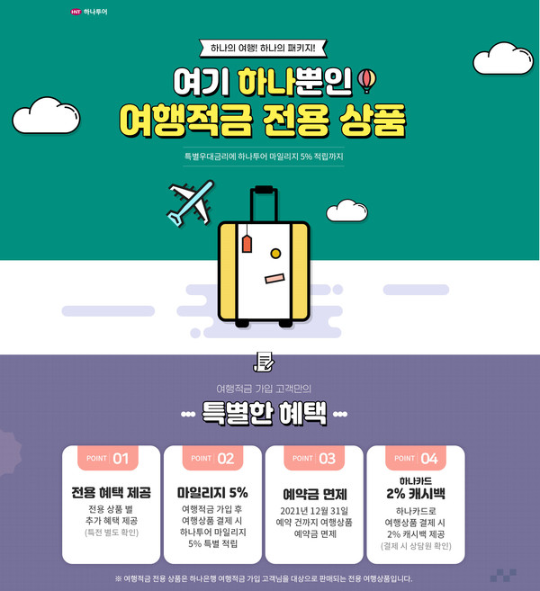 적금 가입 고객 중 선착순 1만 명에게는 미국 달러 환전수수료 90% 면제 및 10% 캐시백 혜택을 제공한다. 또 6월 30일까지 진행되는 '하나의 여행! 하나의 패키지' 이벤트를 통해서는 최대 50만 원의 여행지원금도 지원한다.