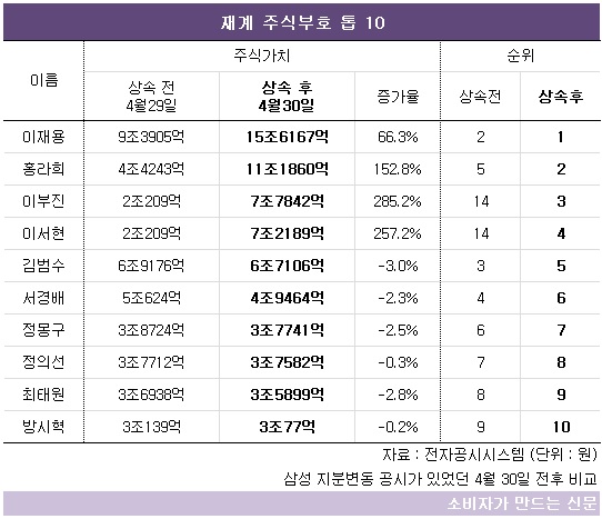 소비자가만드는신문이 지난 4월 30일 이건희 회장 상속 지분에 대한 변동 공시를 전후해 재계 주식부호 순위를 조사한 결과 이재용 삼성전자 부회장과 홍라희 여사, 이부진 호텔신라 사장, 이서현 삼성복지재단 이사장이 나란히 1~4위를 차지했다.