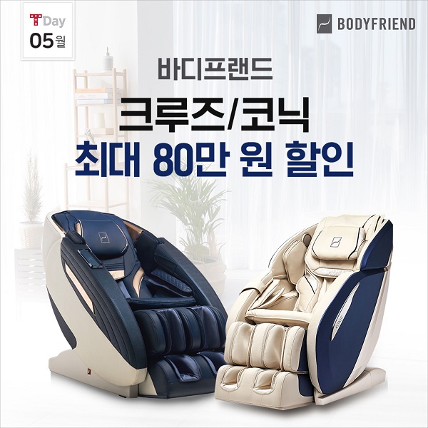 바디프랜드는 ‘갓성비’ 제품으로 유명한 크루즈와 코닉을 선보인다. 가정의 달을 맞아 가장 받고 싶은 선물 1위로 꼽힌 안마의자를 보다 많은 고객들이 부담없이 만날 수 있도록 준비했다.