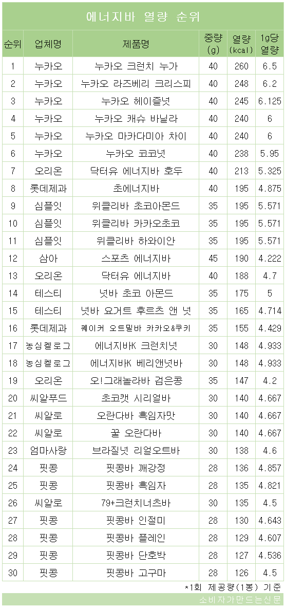 독일 식품기업인 누카오 '크런치 누가(40g)'는 1봉당 열량이 260kcal로 가장 높았고 1g당 열량도 6.5kcal로 가장 높았다. 라즈베리 크리스피(248kcal), 헤이즐넛(245kcal), 캐슈 바닐라(240kcal), 마카다미아 차이(240kcal), 코코넛(238kcal) 등 누카오 제품들이 뒤를 이었다.
