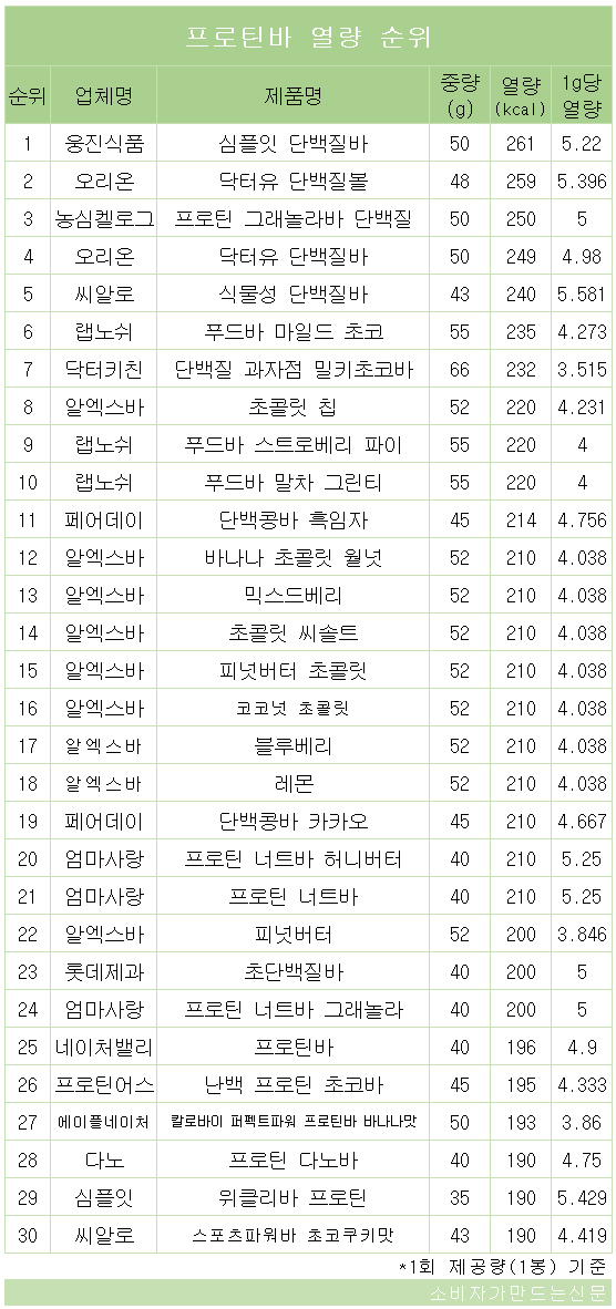 이어 오리온의 '닥터유 단백질볼(48g, 259kcal)', 농심켈로그 '프로틴 그래놀라바 단백질(50g, 250kcal)', 오리온 '닥터유 단백질바(50g, 249kcal)', 랩노쉬 '푸드바 마일드 초코'(55g, 235kcal) 순으로 열량이 높았다.