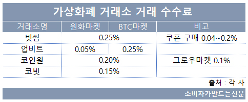 소비자가만드는신문이 거래량 기준 4대 가상화폐 거래소인 빗썸, 업비트, 코인원, 코빗의 거래 수수료를 조사한 결과 최대 5배 가량 차이가 발생했다.