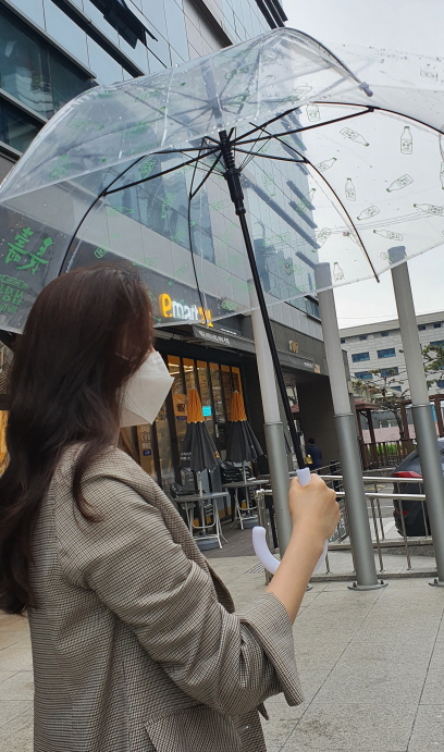장수막걸리 우산은 투명한 장(長)우산에 장수막걸리병을 패턴 디자인해 재미를 더한 상품이다.
