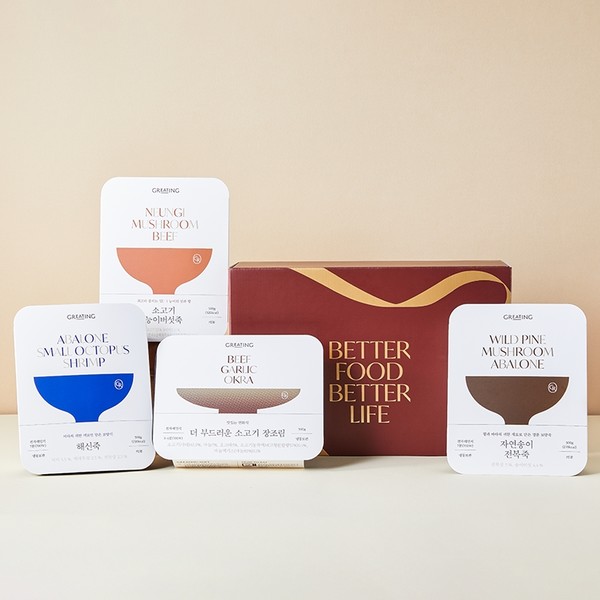 이와 함께 행사 기간 중 그리팅의 죽, 연화식 등으로 구성한 선물세트 11종도 판매한다. 대표 제품은 송이 전복죽(500g), 해신죽(500g), 소고기능이버섯죽(500g), 더 부드러운 소고기장조림(300g) 등 4가지 메뉴로 구성된 ‘보양죽 세트(5만4700원)’와 더 부드러운 소갈비찜(700g), 입에서 녹는 동파육(700g), 더 부드러운 바비큐 폭립(750g) 등 3가지 메뉴로 구성된 ‘연화식 세트(8만2800원)’ 등이다.