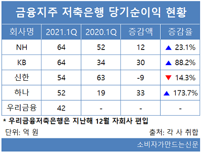 KB저축은행도 1분기 당기순익이 64억 원으로 전년 34억 원 대비 88.2% 증가했다.