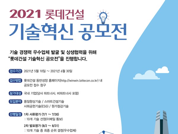 공모전 서류 접수는 5월 10일부터 6월 30일까지 진행하며 국내기업이면 누구나 롯데건설 동반성장 홈페이지를 통해 기술소개서 등 관련서류 제출이 가능하다.