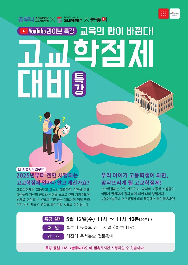 이번 특강은 오는 12일 오전 11시 솔루니TV 유튜브 채널을 통해 라이브 방송으로 진행되며, 2025년부터 전면 시행되는 ‘고교학점제’를 중심으로 변화하는 교육 환경에 대한 정보 제공과 자녀 학습법에 대한 궁금증을 해소하고자 마련됐다.