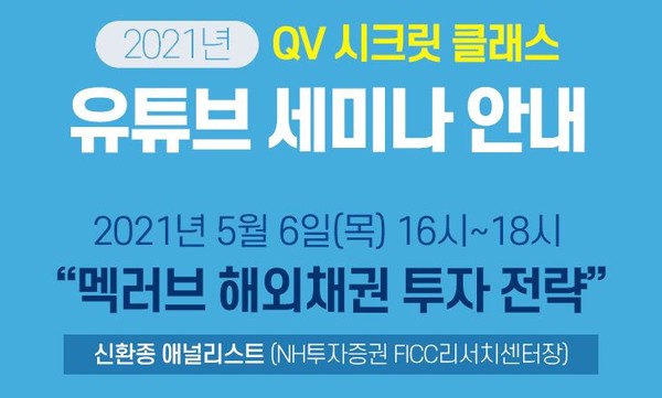 이번 세미나는 ‘2021년 멕러브 해외채권 투자전략’을 주제로 5월 초 현재 상황에서 브라질, 멕시코, 러시아 채권 전망을 국내외의 정치경제적 이슈를 종합해 제시할 예정이다.