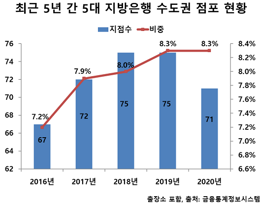 하지만 지난해를 기점으로 수도권 지역 점포 출점에 제동이 걸렸다. 지난해 말 기준 5개 지방은행의 수도권 점포(출장소 포함)는 71곳으로 전년 대비 4곳 감소했다. 다만 전체 지점수도 동반 감소하면서 수도권 점포 비중은 8,3%로 전년과 동일했다. 광주은행이 28곳으로 가장 많았고 전북은행(16곳), 부산은행(11곳), 경남은행·대구은행(8곳) 순이었다.