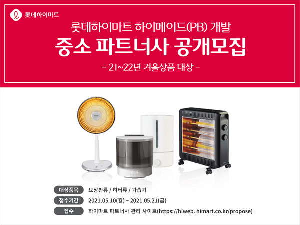 롯데하이마트는 기존 파트너사 외에 더 많은 중소파트너사가 판로를 확대할 수 있도록 지원하기 위해 공개 모집을 진행한다고 밝혔다. 접수를 희망하는 중소파트너사는 하이마트 파트너사 관리 사이트에서 제안서를 제출하면 된다.
