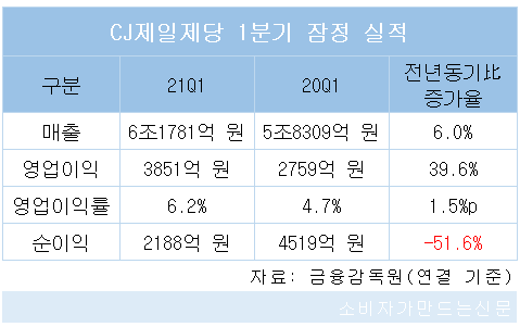 식품사업 부문 매출은 2조3064억 원으로 전년동기 대비 2% 늘었다. 국내 식품 매출은 7% 늘었다. 비비고·햇반 등 주력제품군이 두 자릿 수 안팎의 성장률을 기록했고 온라인 경로 매출이 20% 넘게 증가하며 성장을 이끌었다.