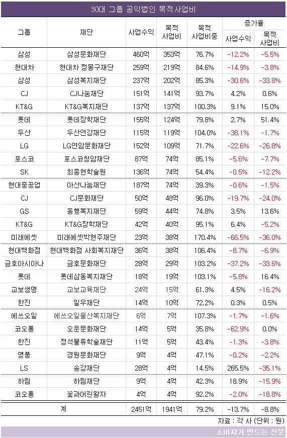 국세청 공익법인공시에 따르면 30대 그룹 계열사 및 오너 일가가 출자한 12월 결산법인 27곳은 지난해 사업수익은 2451억 원, 목적사업비는 1941억 원으로 집계됐다.
