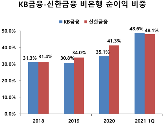 기존 계열사 중에서도 KB증권이 1분기 순이익 2211억 원으로 전년 대비 흑자전환에 성공했다. 그 결과 올해 1분기 KB금융의 비은행 순이익 비중은 전년 말 대비 13.5% 포인트 상승한 48.6%를 기록하며 신한금융(48.1%)을 제쳤다.