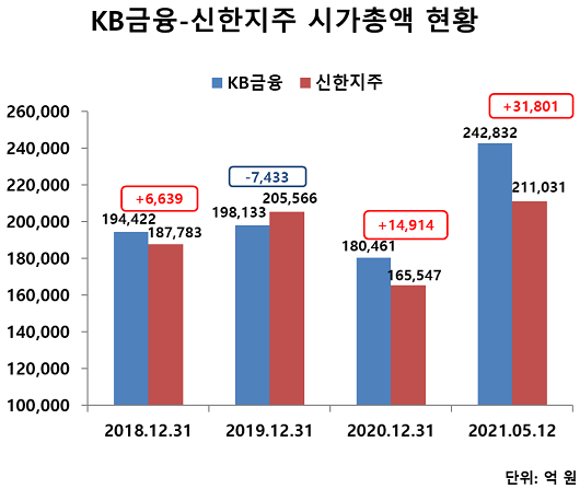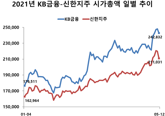 지난 2019년까지 KB금융과 신한금융은 치열한 시총 경쟁을 펼쳤지만 지난해 6월 KB금융이 역전한 뒤로 줄곧 신한금융에 계속 앞서고 있다.