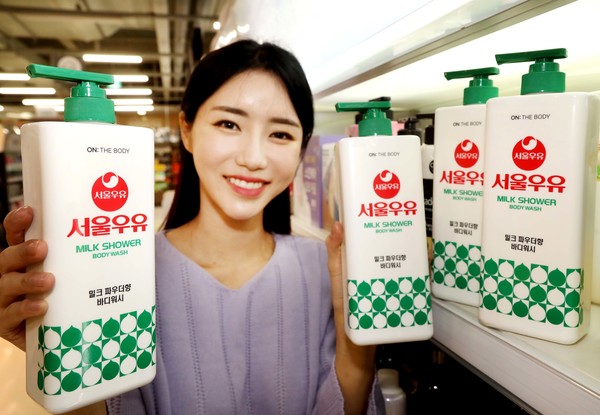 한편 기존 우유갑 패키지와 혼동을 막기 위해 전용 용기를 펌핑 방식으로 개발했으며, 상품 앞면 하단에는 ‘밀크 파우더 향 바디워시’ 표시도 포함했다.
