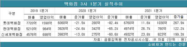 롯데쇼핑‧신세계‧현대백화점 3사의 영업이익만을 두고 증가폭을 비교하면, 롯데백화점(267.9%)이 가장 컸고 신세계백화점(199.3%), 현대백화점(122.2%) 순이었다.