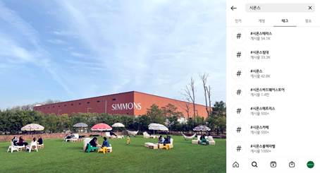 시몬스 관련 최다 해시태그는 ‘시몬스테라스’로 5만4000회 언급됐다. 시몬스 테라스는 경기도 이천에 위치한 시몬스 침대의 복합문화공간이자 이천의 랜드마크다.