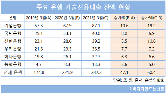특히 기업은행과 신한은행의 기술신용대출 잔액 증가 추세가 뚜렷하게 나타났다. 3월 말 기준 기업은행과 신한은행의 전년 대비 기술신용대출 잔액 증가액은 각각 19조2000억 원과 10조6000억 원에 달했다. 직전 1년(2019년 3월) 대비 증가액이 2배 가까이 늘었다.
