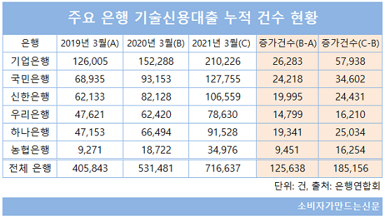 기술신용대출 잔액 뿐만 아니라 대출 누적건수도 급증했다. 올해 3월 말 기준 직전 1년 간 신규 기술신용대출 건수는 18만5156건으로 이전 1년(2019년 3월~2020년 3월) 대비 약 1.5배 급증했다. 기업은행과 농협은행(행장 권준학)는 2배 이상 늘었고 다른 은행들도 크게 증가했다.