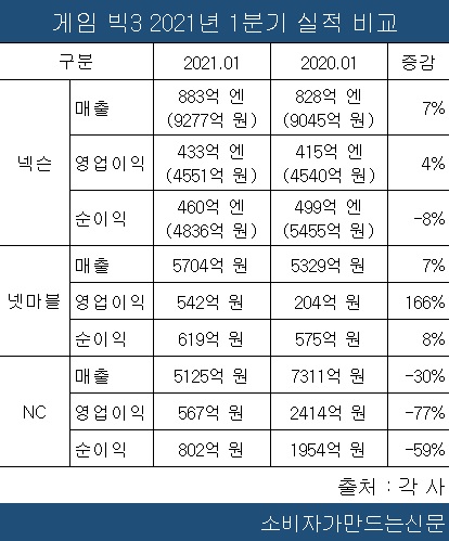 각사에 따르면 넥슨의 1분기 매출은 9277억 원으로 전년 동기 대비 7% 증가했다. 넷마블도 5704억 원으로 7% 증가했다. 반면 NC만 매출이 5125억 원으로 전년 7311억 원과 비교해 30%나 감소했다.