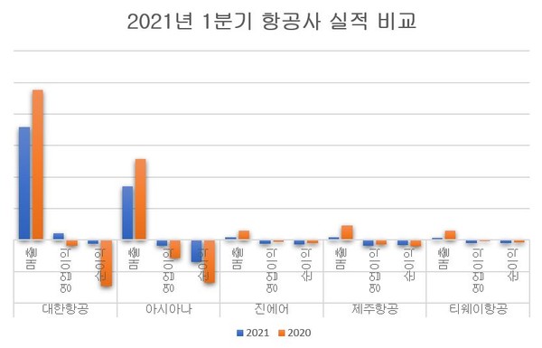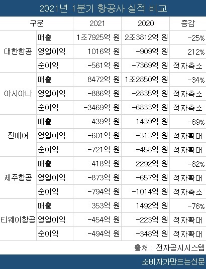 코로나19 장기화의 영향으로 2021년 1분기 매출은 모든 항공사가 줄었다. 18일 금융감독원 전자공시시스템에 따르면 대한항공은 1조7925억 원으로 전년동기 대비 25% 감소했고 아시아나항공은 8472억 원으로 34%, 진에어는 439억 원으로 69%, 제주항공은 418억 원을 기록하며 82%, 티웨이는 353억 원으로 76% 감소했다.