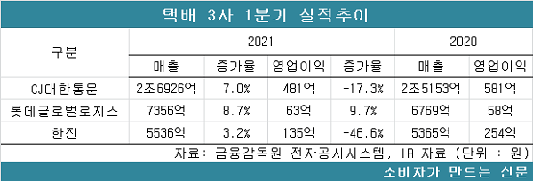 택배업계 과로 이슈와 관련된 종사자의 근로환경 개선 등에 비용이 들어 영업익도 감소했다는 게 관계자들의 설명이다.