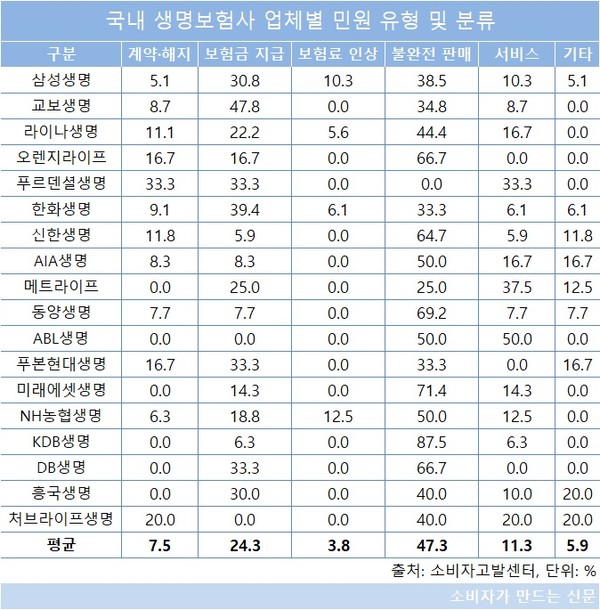 지난해 생명보험 서비스에서 소비자들이 가장 많이 제기한 불만은 '불완전판매'로 나타났다. 전체 생명보험사 민원 가운데 평균 47.3%가 ‘상품 계약 시 정확한 설명을 듣지 못했다’는 등의 불완전판매 문제에 집중됐다.