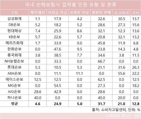 사고처리 민원은 자동차보험 비중이 높은 AXA손해보험이 55.6%로 가장 높았고 KB손해보험과 롯데손해보험, 삼성화재 등도 30%가 넘는 비율을 기록했다.