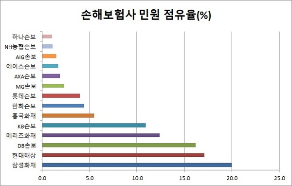 지난해 계약건수 약 3261만 건으로 업계 1위인 삼성화재는 민원 점유율도 20%로 1위를 기록했다.