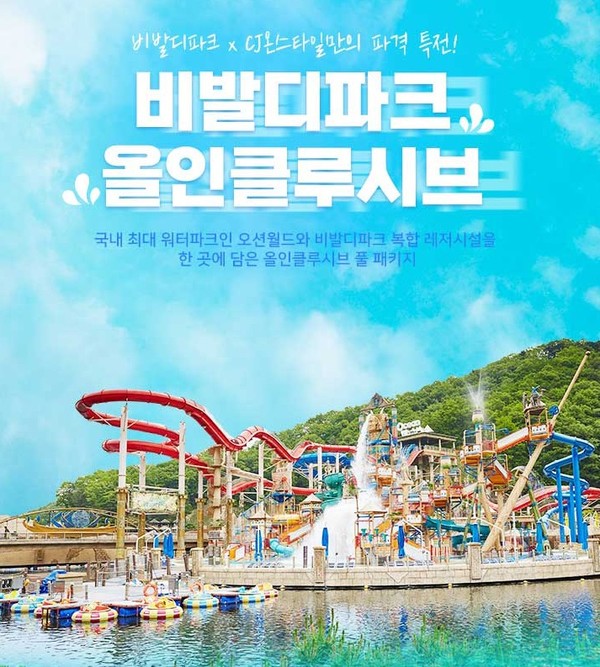‘여름휴가의 성지’인 홍천 비발디파크에서 숙박하면서, 복합 레저시설과 국내 최대 워터파크 오션월드도 이용 가능한 올인클루시브 패키지이다. 객실·워터파크·조식·7가지 액티비티 2인 이용권이 모두 포함되어 있고, 미취학아동 2인이나 초등학생 1인까지는 동일 혜택이 무료 제공돼 가족 여행에 적합하다. 월~목 사이에는 30시간 스테이 혜택이 적용되어, 여행 일정을 여유롭게 계획할 수 있다. 5월 29일부터 여름휴가 성수기 7월 22일까지 이용 가능하다.