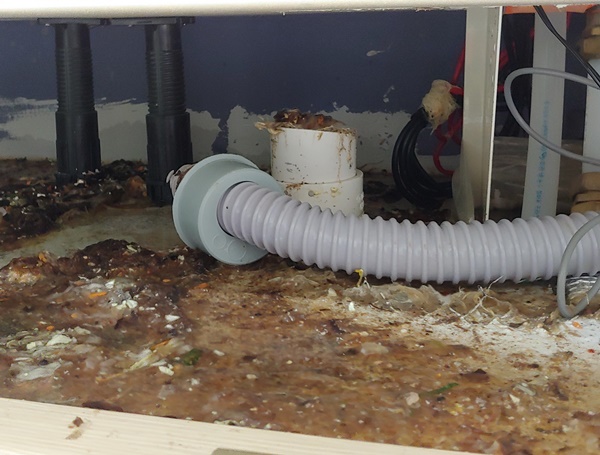 아랫집으로부터 천장에 물이 떨어진다는 이야기를 듣고 원인을 찾던 중 싱크대 걸레받이를 뜯어보니 음식물과 물이 범벅인 상태로 고여 있었다.