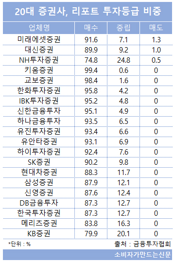 17개 증권사는 매도 리포트를 단 한 건도 내지 않았다. 키움증권의 경우 매수 리포트 비중이 99.4%로 가장 높았다. 교보증권 98.4%, 한화투자증권 95.8%, IBK투자증권 95.2%, 신한금융투자 95.1% 등 매수 리포트 비중이 95%를 넘는 곳도 5곳을 넘었다.