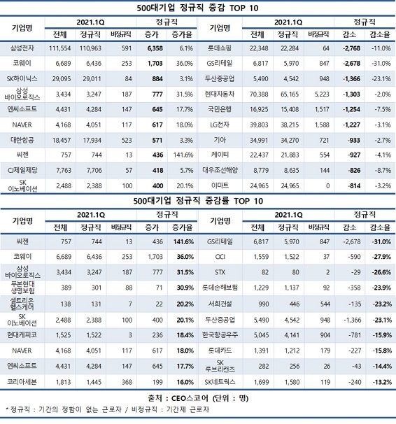 기업별로는 삼성전자와 코웨이의 정규직이 1000명 이상 증가했다. 삼성전자의 정규직은 3월 말 현재 11만963명으로 2019년 4분기보다 6.1%(6358명) 늘어 직원 증가수에서 압도적 1위를 나타냈고, 같은 기간 코웨이의 정규직은 36%(1703명) 증가해 6436명을 기록했다.
