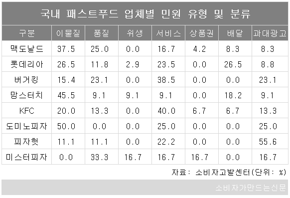 지난해 소비자고발센터에 접수된 패스트푸드 민원을 유형별로 살펴보면 패스트푸드 업체 8곳 가운데 4곳에서 '이물질' 민원 비중이 가장 높았다. 도미노피자와 맘스터치는 이물질에 민원이 집중됐고 맥도날드와 롯데리아도 20~30%의 높은 비중을 기록했다.