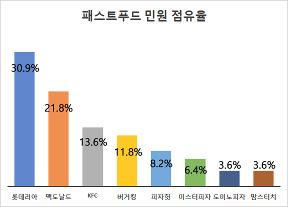 업계 1, 2위인 롯데리아와 맥도날드의 민원 점유율 순위도 매출 규모와 엇갈렸다. 매출 2위(6831억 원)인 롯데리아는 민원 점유율 1위(30.9%)를, 매출 1위(9800억 원)인 맥도날드는 민원 점유율 2위(21.8%)를 기록했다.