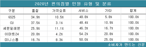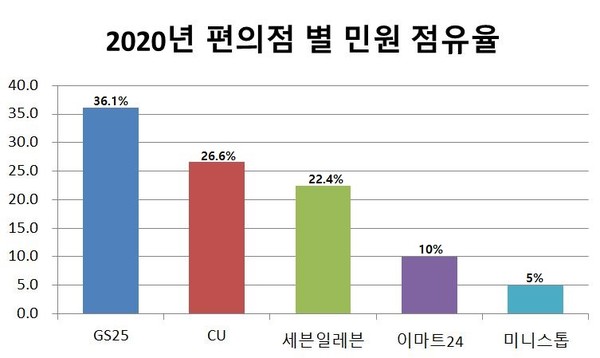 GS25‧CU‧세븐일레븐‧이마트24‧미니스톱 등 국내 대표 편의점 5개사를 대상으로 2020년 한 해 동안 소비자고발센터(www.goso.co.kr)에 제기된 민원을 분석한 결과 GS25의 민원점유율이 36.1%로 가장 높았다.