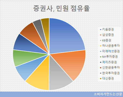 반면 리테일 부문 강자인 키움증권(2조5234억 원)은 소비자 불만이 집중되면서 민원점유율이 23.1%로 가장 높았다. 자기자본 순위 4위인 삼성증권(5조2069억 원)도 민원점유율 15.4%를 기록했다.