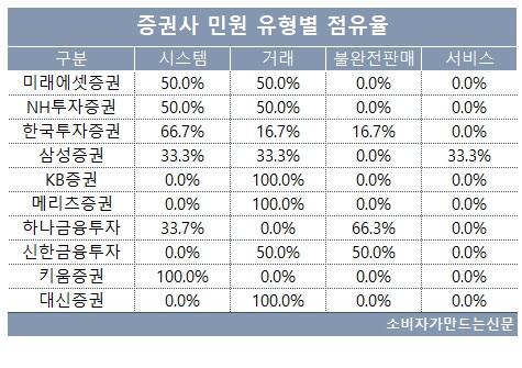 한국투자증권, 미래에셋증권, NH투자증권 등도 시스템 관련 불만이 가장 많았다. KB증권, 메리츠증권, 대신증권은 모든 민원이 거래 관련 민원에 집중됐다.
