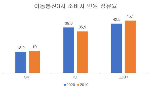 이동통신 3사 중 민원 점유율이 가장 높은 곳은 LG유플러스로 42.5%를 차지했다.