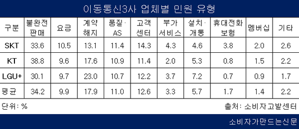 지난해 소비자들이 이동통신 관련해 가장 많이 제기한 불만은 ‘불완전판매’인 것으로 나타났다. 불만 유형 중 '불완전판매'에 대한 민원이 34.2%를 차지했다. 이어 계약 해지가 17.9%, 고객센터 문제가 12.6%, 품질과 AS가 11%로 뒤를 이었다.
