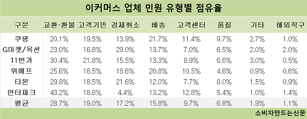민원 유형별로는 ▶교환·환불에 대한 불만이 4년 연속 가장 가장 많은 것으로 나타났다. 6개사 평균 28.7%가 제품 불량이나 단순 변심 등 문제로 교환이나 환불을 요구했을 때 원활히 이뤄지지 않았다고 불만을 표했다.
