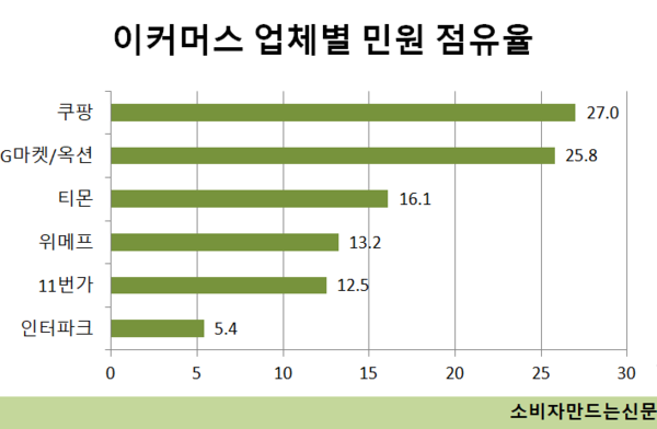 이커머스 주요 6개사를 대상으로 소비자고발센터(www.goso.co.kr)에 제기된 소비자 불만을 집계한 결과 거래액 규모 1위인 쿠팡(22조 원)의 민원 점유율이 27%로 역시 가장 컸으며, 이어 G마켓·옥션(이베이코리아, 20조 원)이 25.8%로 2위였다.