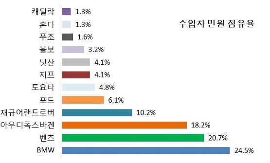 BMW는 지난해에 이어 2년 연속 민원 점유율 1위다. 시장 점유율은 21.2%로 벤츠(27.9%)에 이어 2위지만 민원 점유율은 더 높아 개선이 필요한 모습이다.