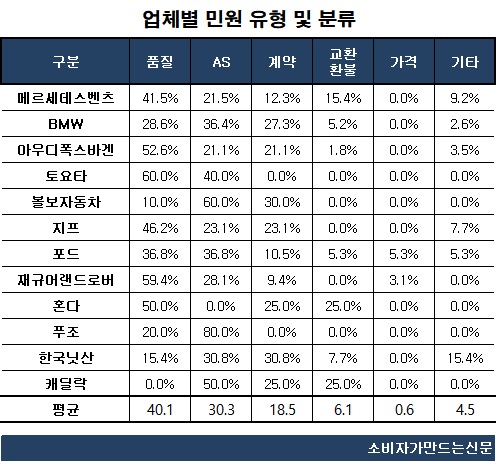 벤츠, 아우디폭스바겐, 토요타, 지프, 재규어랜드로버, 혼다는 품질 불만이 1위, BMW, 볼보, 푸조, 닛산, 캐딜락은 AS 불만이 더 높았다. 포드는AS와 품질이 동일 비율이었다.