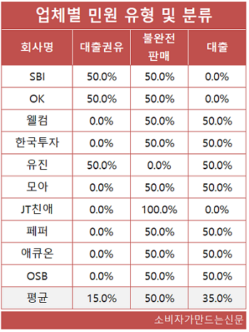 저축은행의 유형별 소비자 불만은 크게 ▶불완전판매(50%) ▶대출(35%) ▶대출권유(15%) 등 3가지로 나뉘었다.