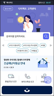 고객센터에서는 결제예정금액안내, 이용내역조회는 물론 즉시 결제 등 서비스를 이용할 수 있다. 또 하나카드 손님Care센터의 데이터를 기반으로 그 동안 고객이 자주 문의한 내용 중심으로 업무처리 화면을 제공한다.