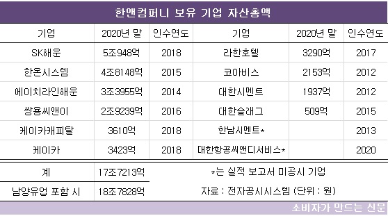 한앤컴퍼니가 보유한 기업들의 자산총액은 2017년 말 11조 원대, 2018년에는 17조 원대로 커졌다. 지난해에는 대한항공 기내식 사업을 담당하는 대한항공씨앤디서비스도 인수했다.