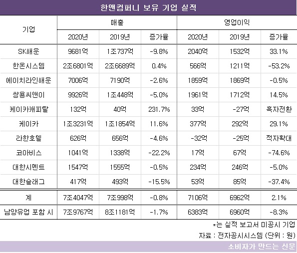 한앤컴퍼니가 최대주주로 있는 12개 기업 중 실적 보고서가 공시되는 10곳의 지난해 매출은 7조407억 원이다. 전년과 비교하면 0.8% 감소했다. 영업이익은 7106억 원으로 2.1% 늘었다.