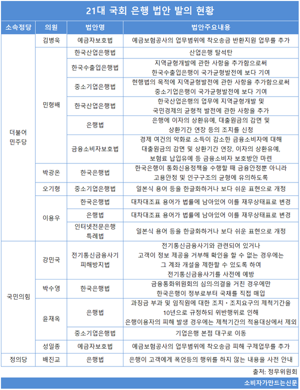 먼저 은행 관련 법안에서는 더불어민주당 민형배 의원과 이용우 의원기 각각 6건, 3건 발의했으며 윤재옥 국민의힘 의원이 2건 발의했다. 이외에도 더불어민주당 김병욱 의원, 박광온 의원, 오기형 의원, 이용우 의원과 국민의힘 강민국 의원, 박수영 의원, 성일종 의원, 배진교 의원이 각 1건씩 발의했다.