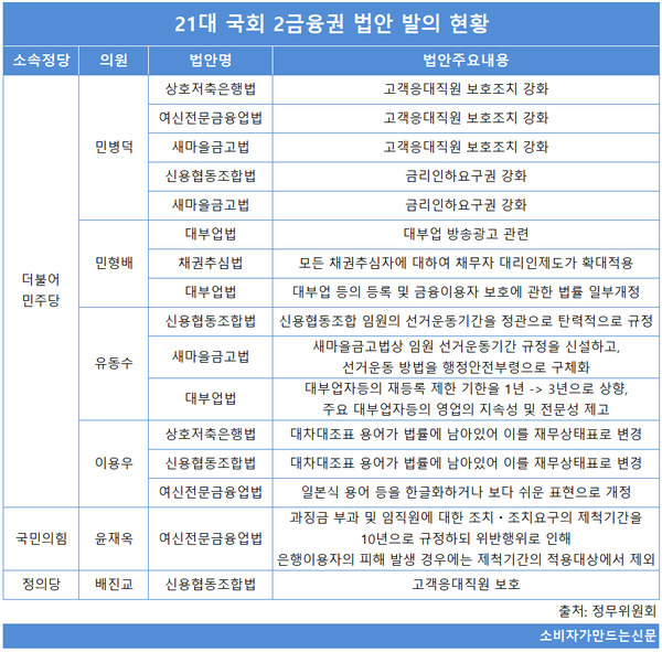더불어민주당 민병덕 의원과 민형배 의원이 각각 5건, 3건 발의했으며 유동수 의원과 이용우 의원이 각 3건씩 대표 발의했다. 국민의힘에서는 윤재옥 의원이, 정의당에서는 배진교 의원이 각 1건씩 2금융권 관련 법안을 대표 발의했다.